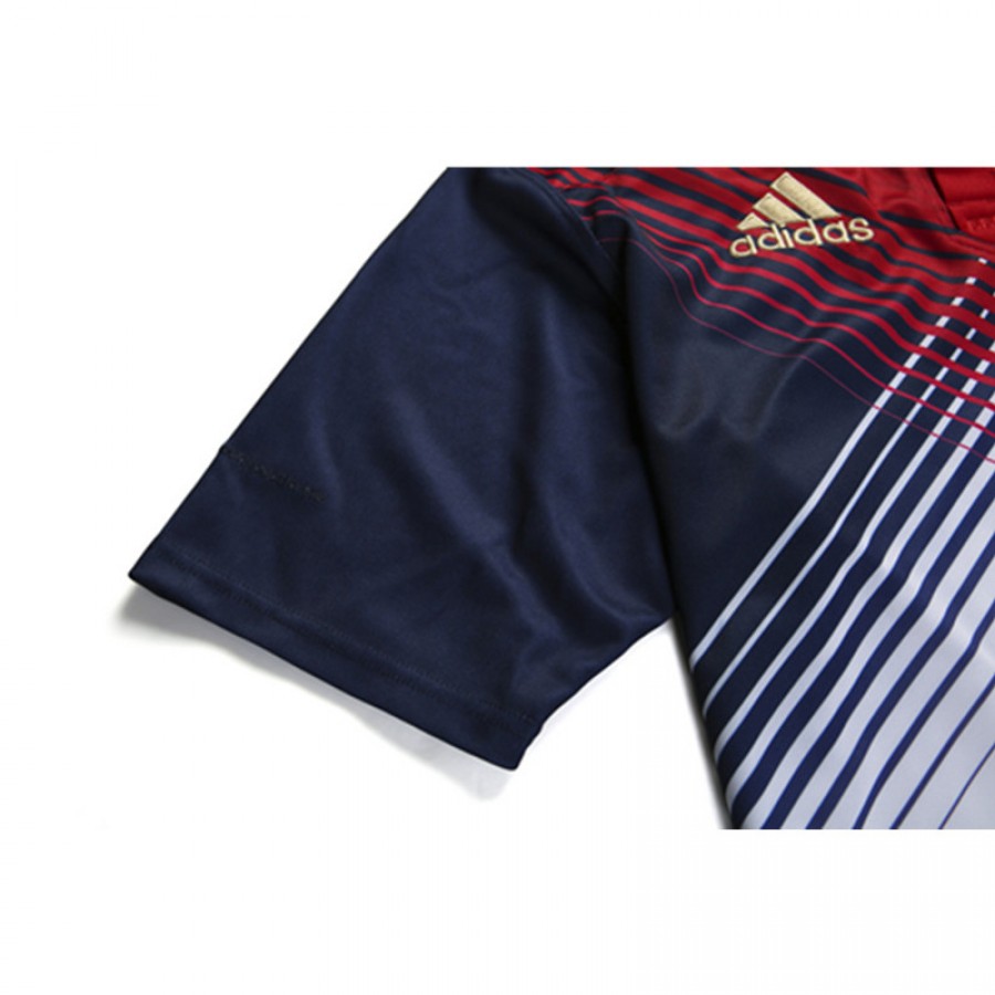 Show your pride for white red with the 2017 France Home Rugby Jerseys from Adidas. The official Jerseys features a navy on the collar and on the intricate modern design. The iconic Adidas three stripes run across the tops of the shoulders. The world famous rooster badge of France rugby is embroidered on the upper left chest.