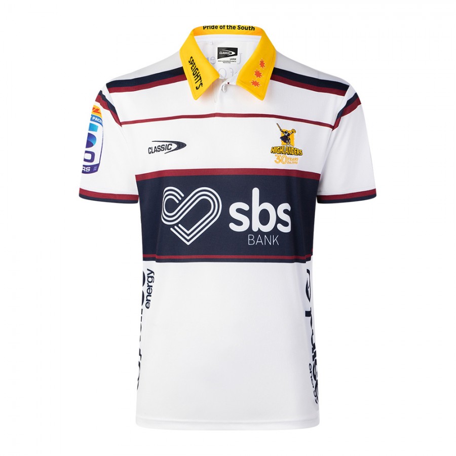 Show your pride on the road with the Highlanders Rugby Mens Away Jersey 2026. This striking white kit is a modern take on a classic Highlanders look, combining clean lines with bold Southern detailing. Featuring the iconic navy and maroon chest band, contrast yellow collar, and official 30-year Highlanders crest, this jersey honours the club’s legacy while delivering a fresh, contemporary edge. Engineered in lightweight, breathable performance fabric, it’s designed for comfort whether you’re backing the boys from the stands or wearing it day-to-day. Finished with official sponsor branding and premium construction, this is an authentic supporter jersey built for true Highlanders fans.
