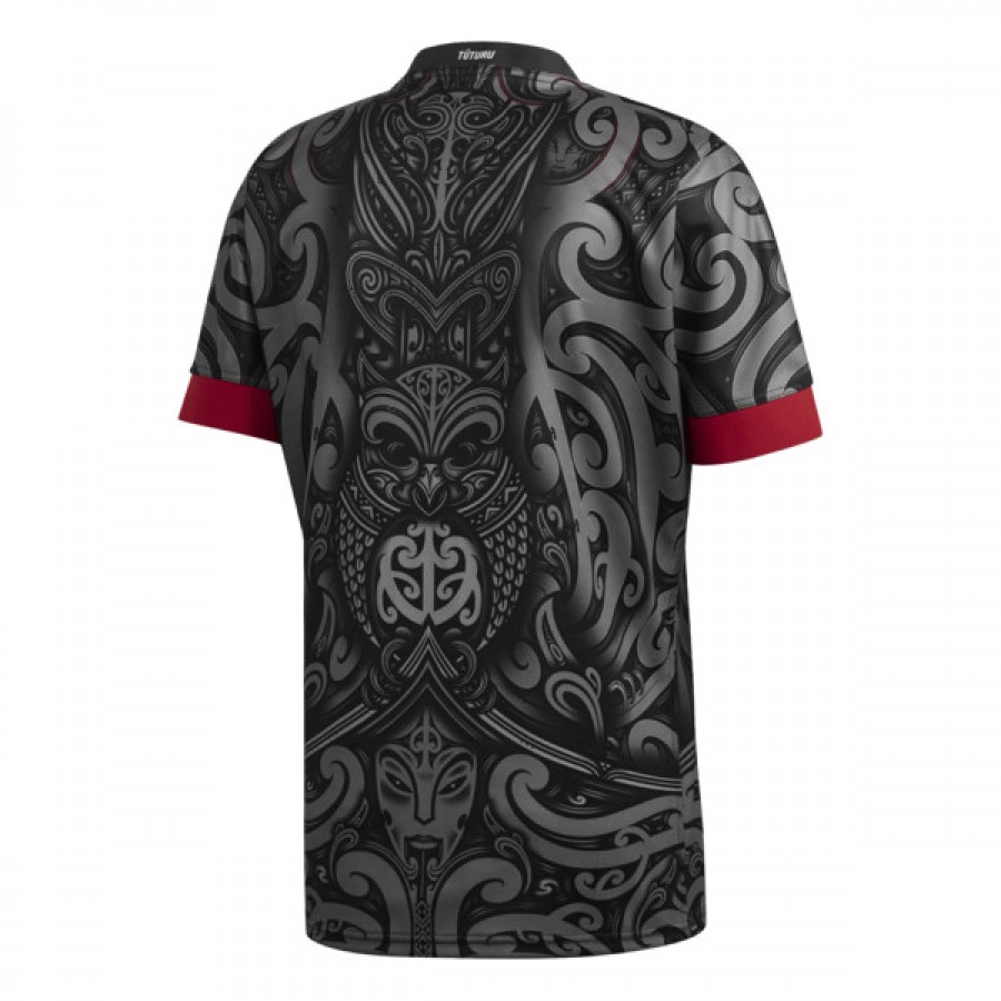 A display of devotion. This adidas Māori All Blacks rugby 2020 jersey bears an eye-catching allover graphic created by artist Dave Burke and the team’s Māori Cultural Adviser, Luke Crawford. Symbolising commitment, the flowing lines display a hint of red on the chest and shoulders, the first time the sacred colour has been used in an All Blacks kit. The soft fabric will stand up to hits on the pitch and keep you comfortable in the stands. Even better, it’s made from Parley Ocean Plastic yarn that’s upcycled from plastic waste.