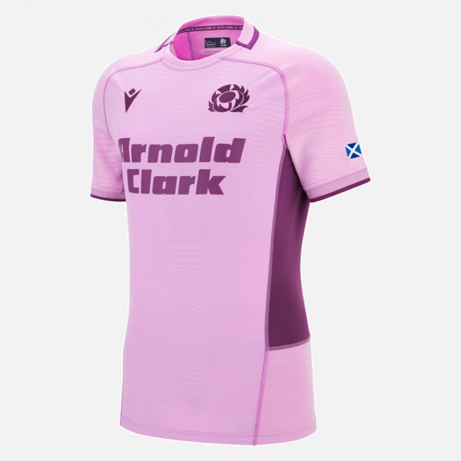 Scotland Rugby 2025 Mens Away Jersey - purple tight fit shirt with tone on tone pattern on the body, round collar with aubergine details, Saltire embossed on the rear panel and aubergine Scotland crest embroidered over the heart. (PLEASE NOTE: these shirts are designed to be close fitting.